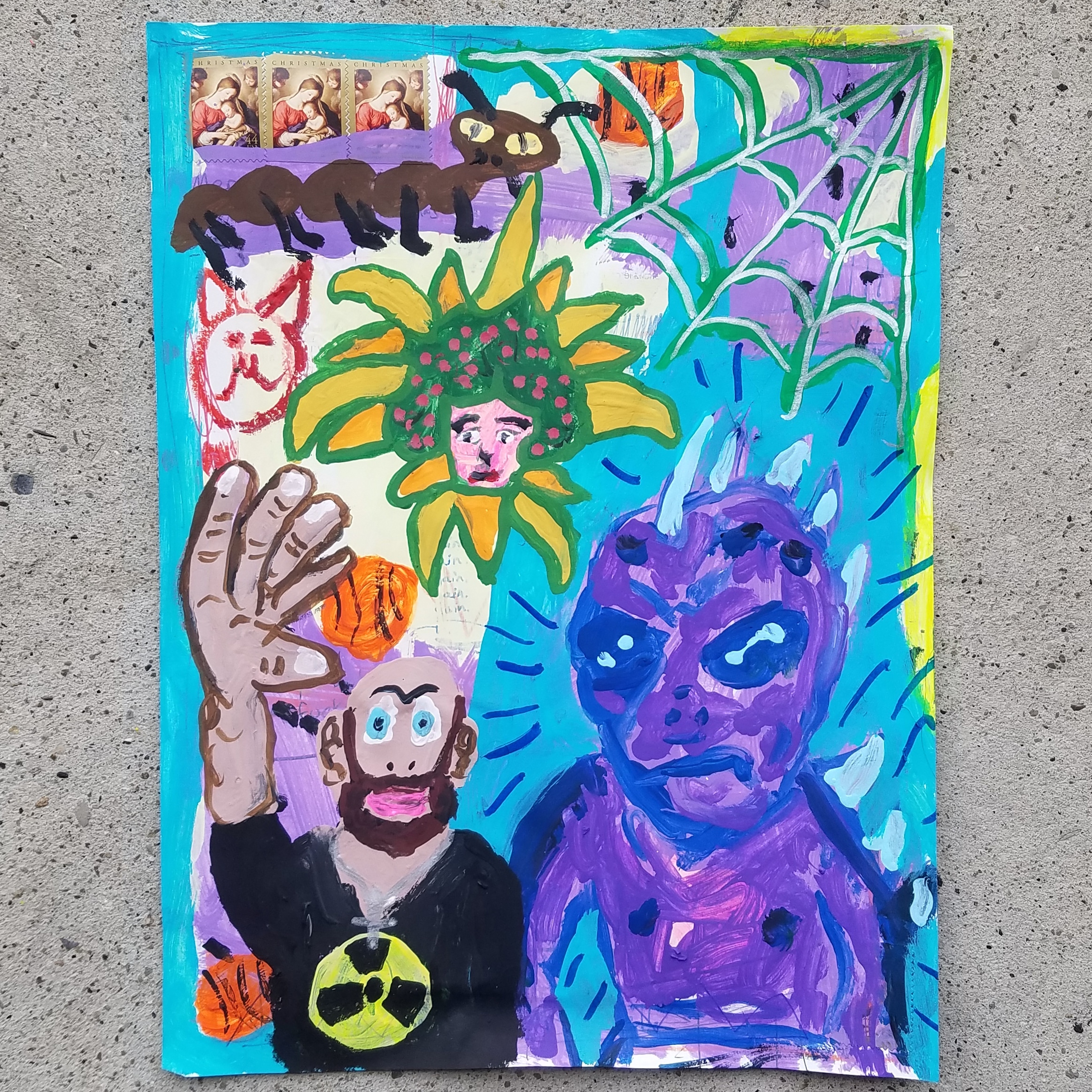 .acrylic paint, gouache, oil pastel, sharpie, krink markers, stamps, collage on paper .9"x12" .2018