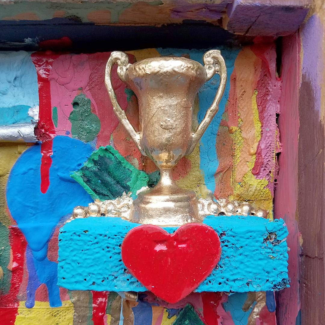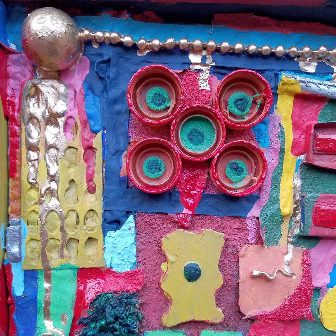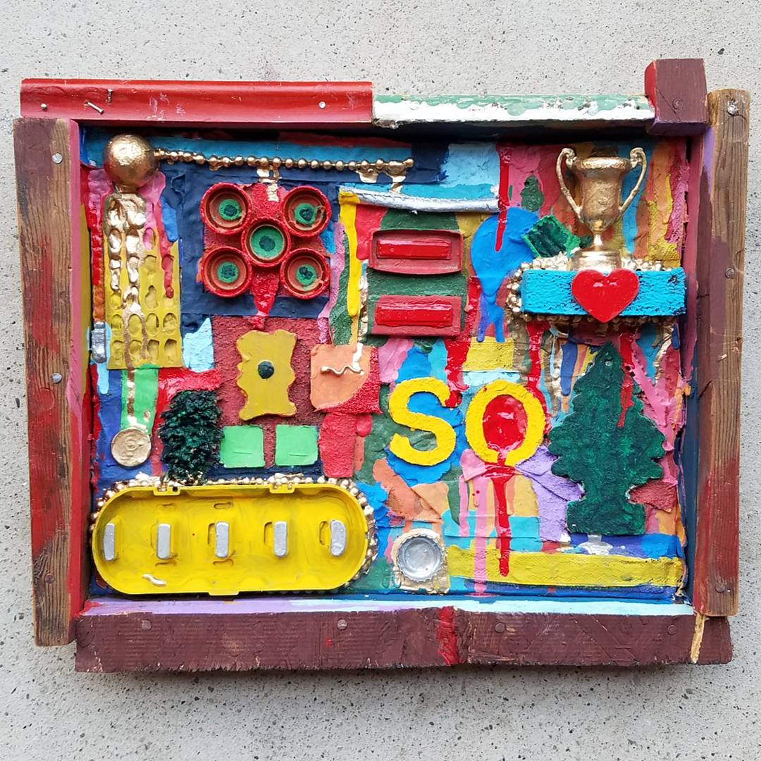 .acrylic paint, oil paint, enamel paint, felt, lace, carpet, fabric, beads, air freshener, sponge, found objects various adhesives, on canvas with scrap-wood frame
