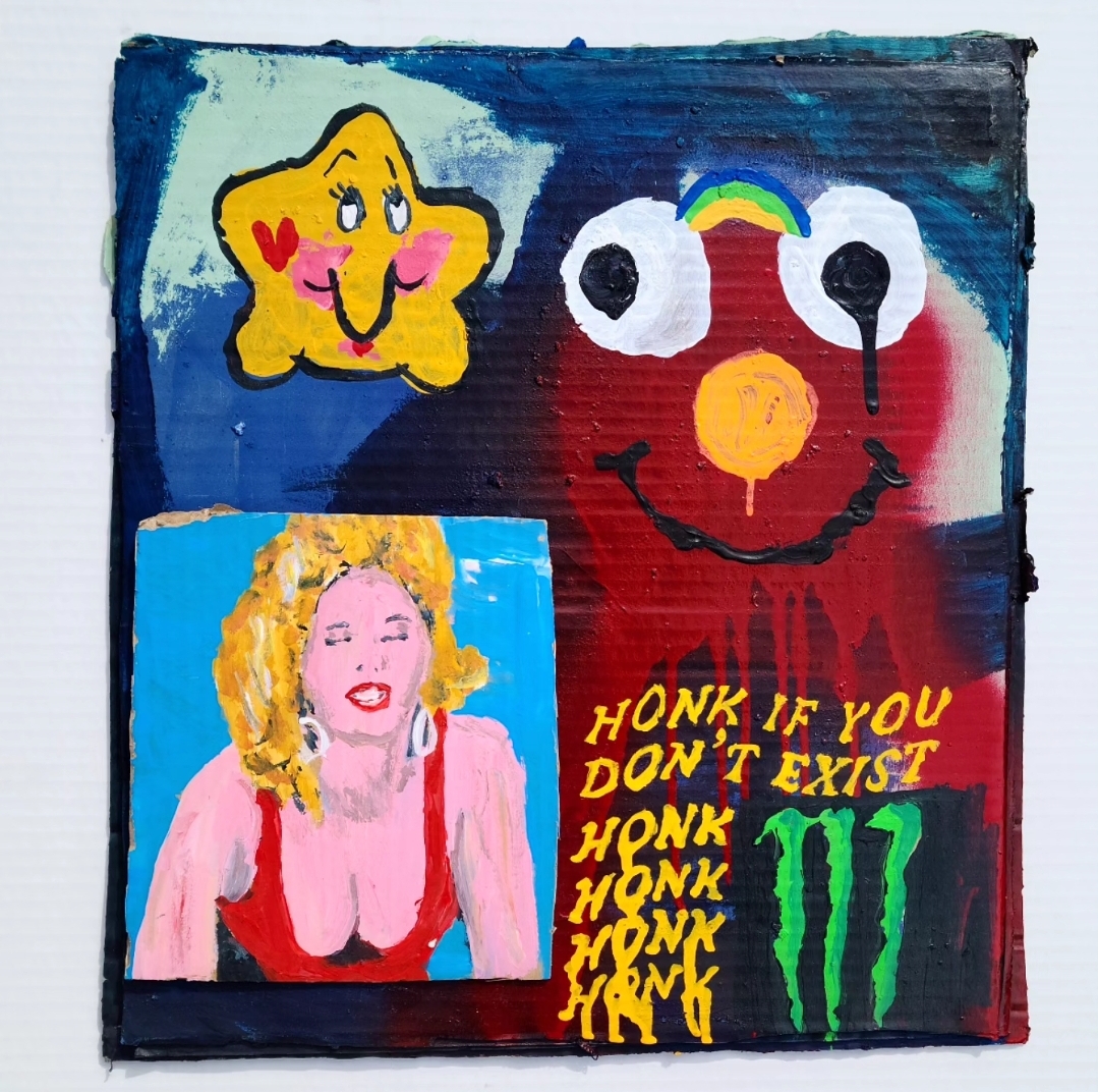 .acrylic, housepaint, enamel, spraypaint, collage on carboard support .16"x16" .2019