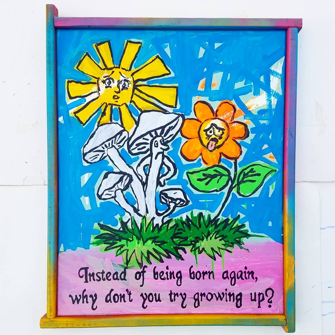 .acrylic, spray paint, paint marker, enamel paint on canvas in artist's frame .17"x21" .2019