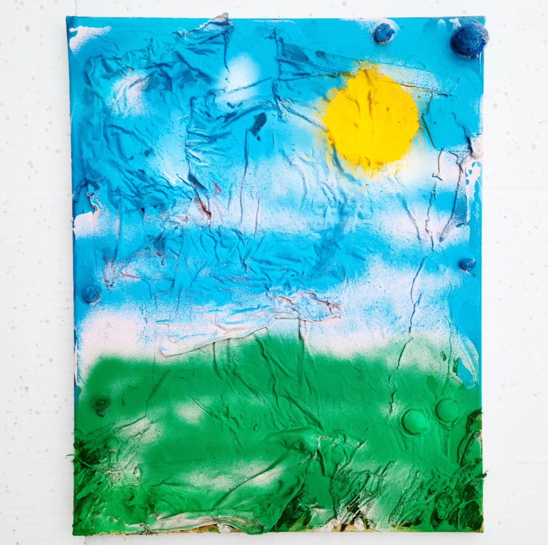 .spray paint, acrylic, found objects, fabric, various adhesives on canvas .16"x20" .2016-2023
