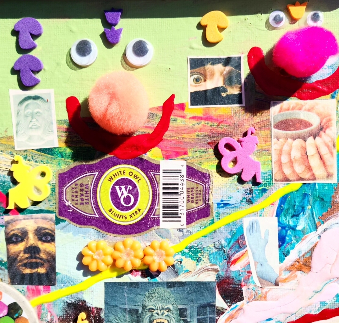 Acrylic, enamel, puff paint, glitter, googly eyes, found objects, felt, paper collage on canvas