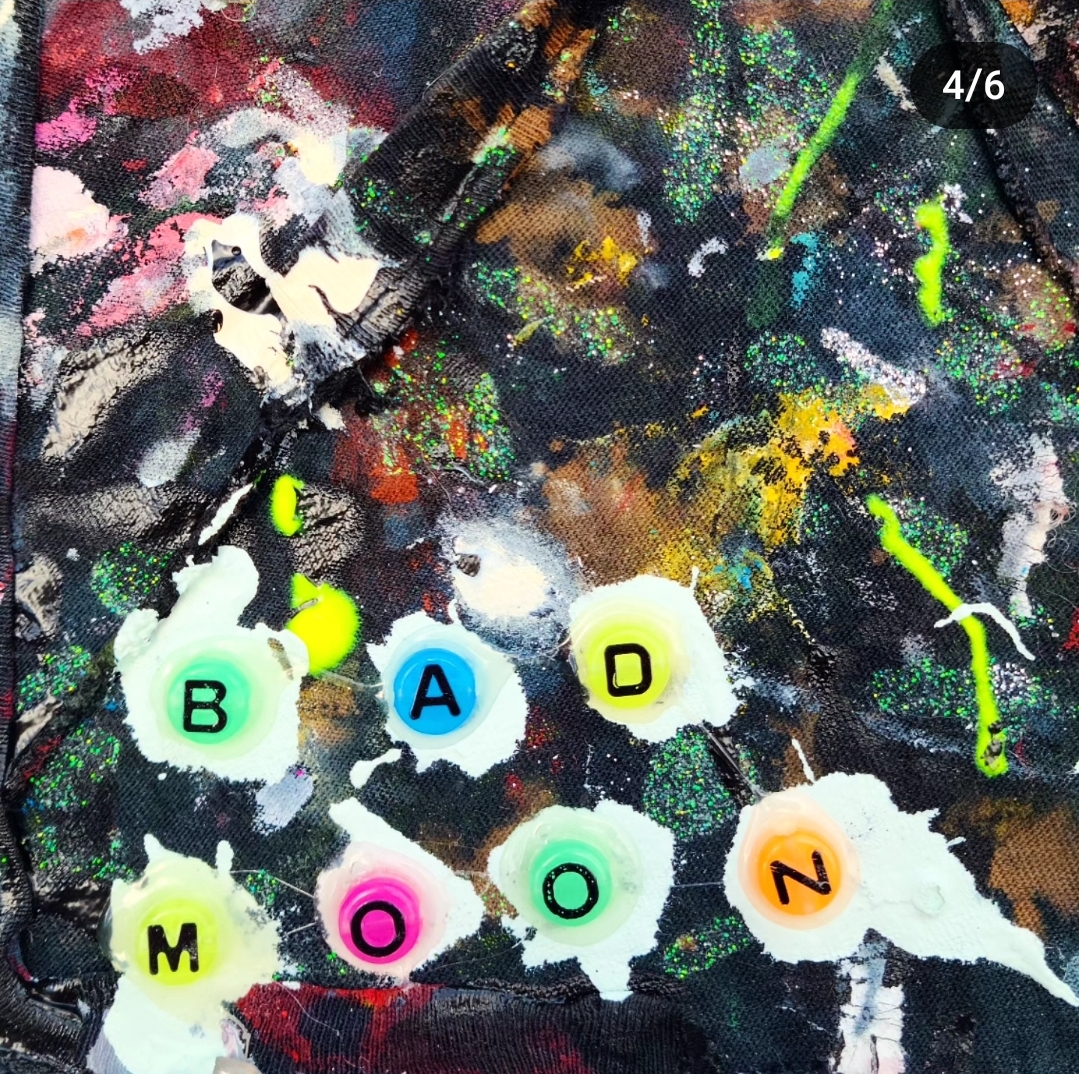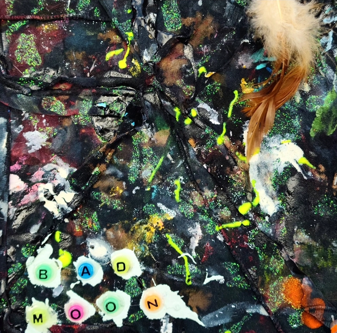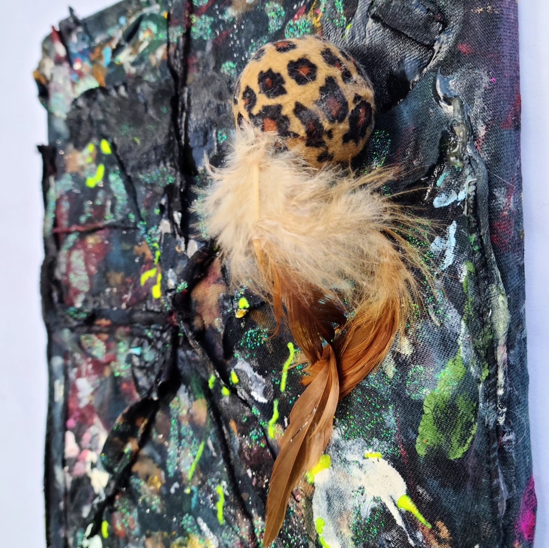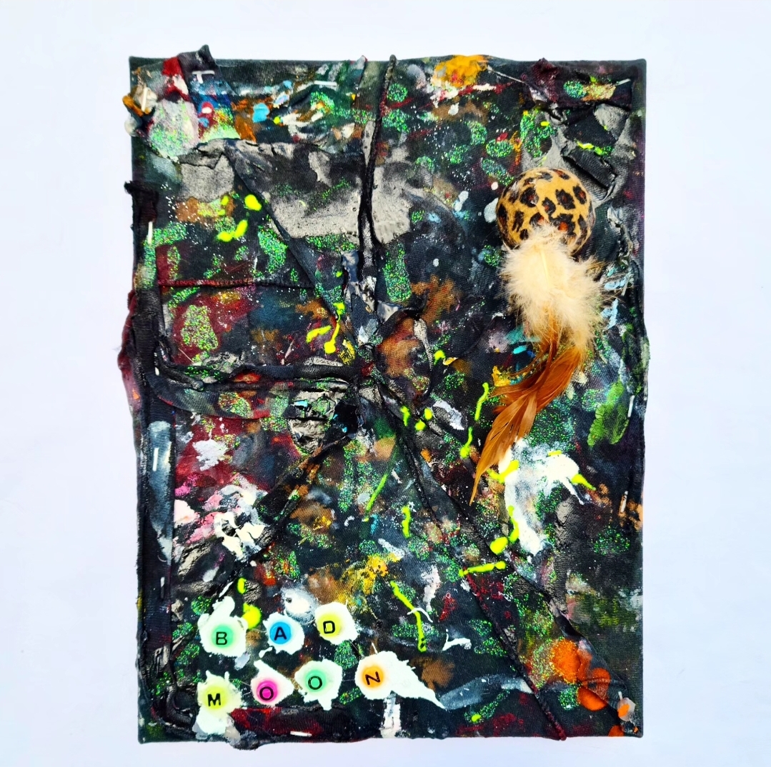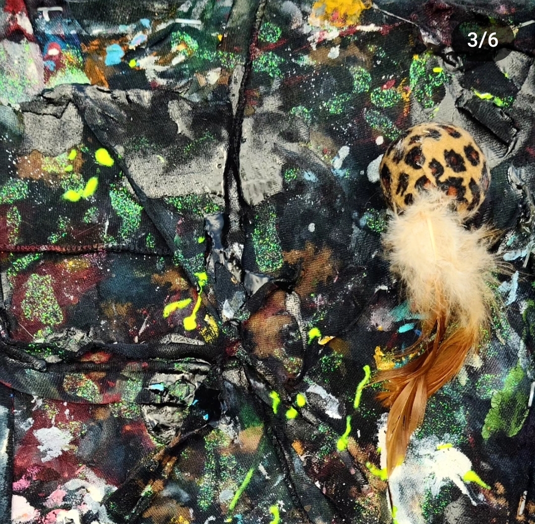 Acrylic, enamel, glitter, glow-in-the-dark paint, bleached fabric, staples, various adhesives, glow-in-the-dark beads, leopard print cat toy with feathers.
