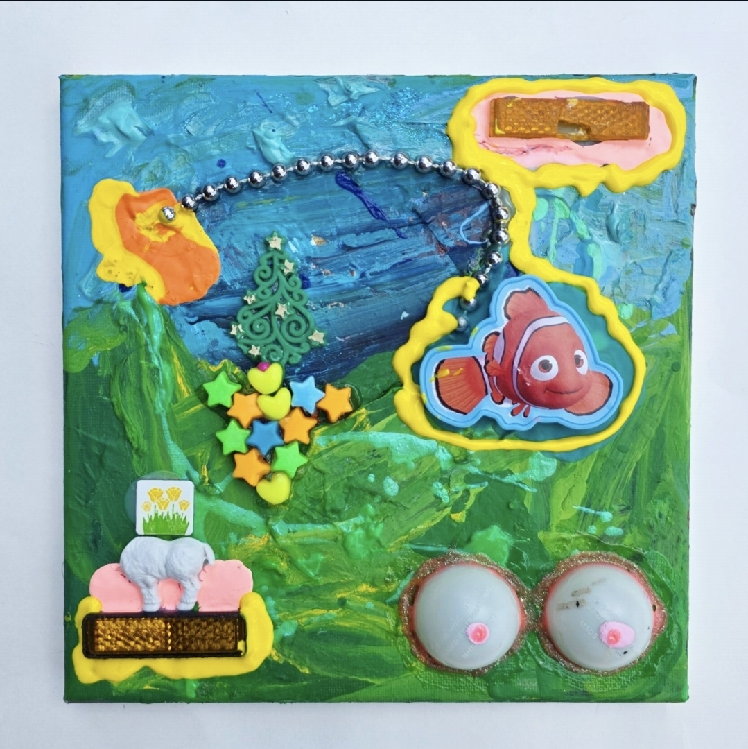 . Acrylic, puff paint, found objects .8"x8" .2025